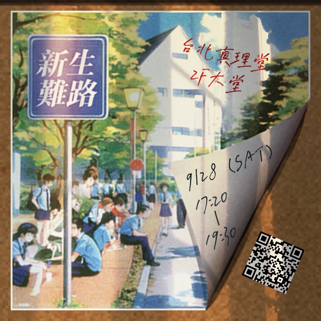 海報中描繪了一條通往學校的道路,路上有許多學生,象徵新生共同面對的挑戰與成長。路牌上寫著「新生難路」,反映新生在這段旅程中的艱辛與機會。整體設計增添了畫中畫的趣味感,使觀者更能身歷其境。